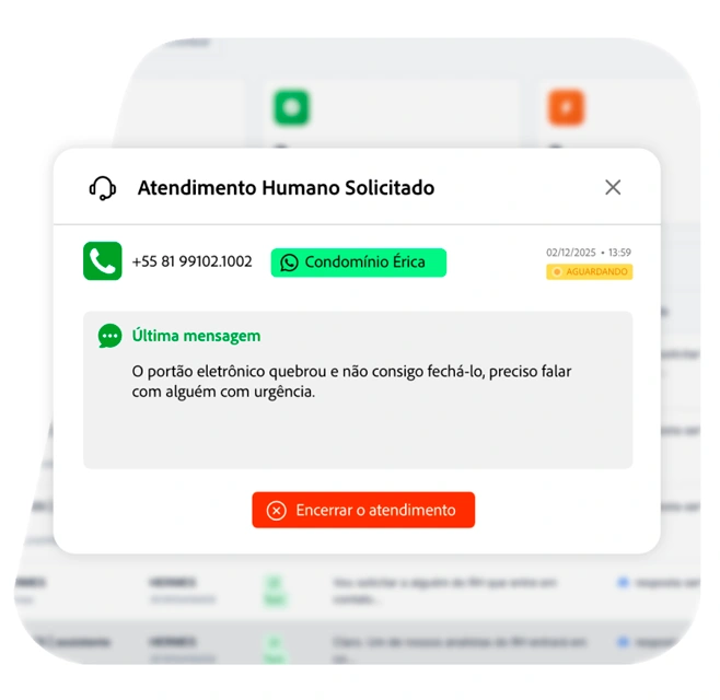 Algumas vezes o morador precisa falar com um humano, seja pelo nível de urgência, seja por uma necessidade específica. Isso não é um problema para o portarIA, que avisa às pessoas cadastradas a necessidade dessa interação.