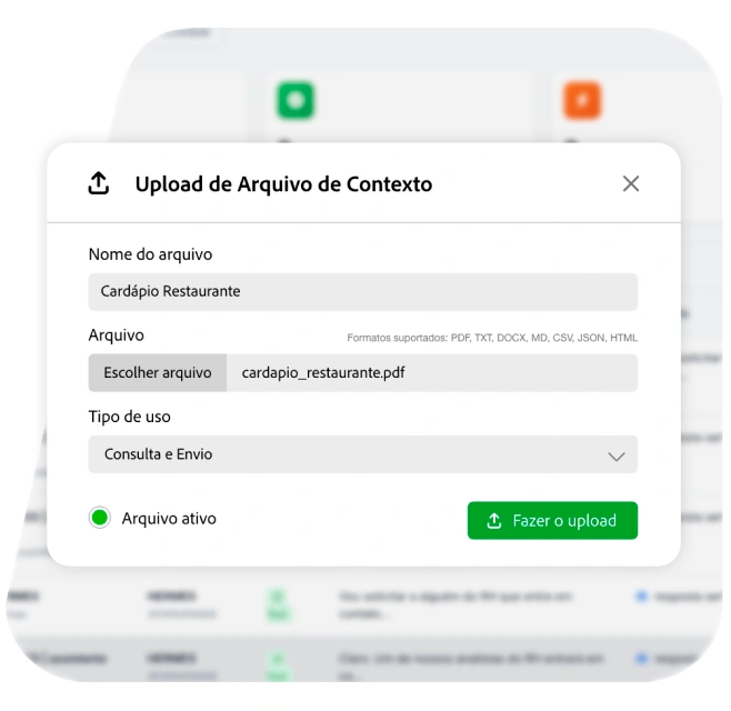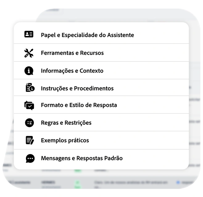Configure tom de voz, estilo de resposta, temas que podem e não podem ser abordados, o humor e até mesmo o sotaque de seu assistente de maneira super simples e rápida. Os ajustes são feitos rapidamente, sem exigir conhecimento técnico.