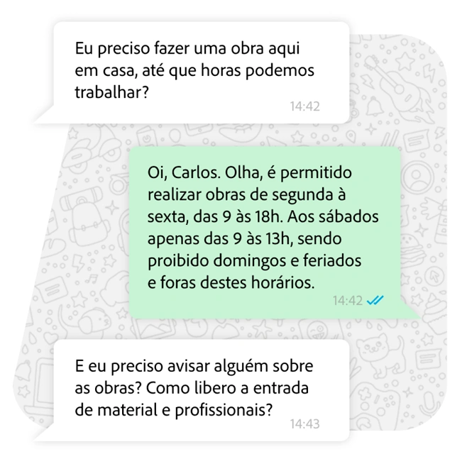 A maior parte das dúvidas que chegam por WhatsApp não exigem interação humana. Dúvidas sobre horários, regulamento interno, taxas, reservas de áreas comuns, indicação de fornecedores e outros temas são resolvidos de forma eficiente.